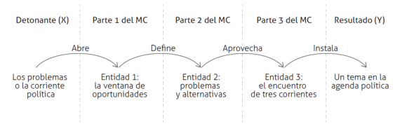De acuerdo a esto, las tres entidades que intermedian entre las causas y el resultado son representadas como la ventana de oportunidades, la definición de problemas y alternativas, y el encuentro entre las tres corrientes.