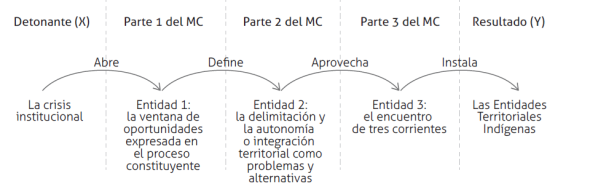 La figura 2 presenta a la crisis institucional como detonante, lo que sugiere que la ventana de oportunidades en los procesos constituyentes se abre por el influjo de la corriente política y no tanto por la corriente de los problemas. En la Entidad 2, se describe cómo el primer acoplamiento entre problemas y soluciones, es definido por la delimitación y la autonomía de los territorios indígenas. La Entidad 3, considera que una vez definido el problema entre Estado y pueblos indígenas en torno a la tierra, y su posible alternativa a partir de la delimitación y la autonomía o la integración territorial, este paquete es acoplado a la dinámica que trae consigo el proceso constituyente. Es decir, se acoplan a la corriente política, instalándose con ello las Entidades Territoriales Indígenas como resultado de todo el proceso.
