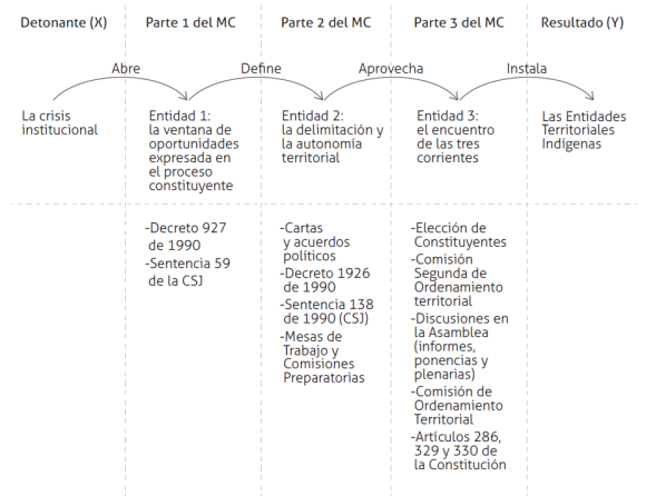 Dentro del modelo de las corrientes múltiples, los emprendedores de política son los encargados de llevar a cabo dichos acoplamientos entre los problemas y las soluciones, y luego entre estos y la corriente política (Kingdon, 2003, p. 182). Como se ha planteado en el punto anterior, estos acoplamientos son posibles gracias a ciertos marcos institucionales determinantes, por lo que el modelo de las corrientes múltiples se ve complementado con la teoría institucional. Así es como el mecanismo hipotético trabaja a partir del acoplamiento institucional. Se ha señalado que todo mecanismo causal requiere ser operacionalizado a la luz de un caso de estudio. En este texto, el caso ha sido el de la territorialidad indígena durante la constituyente de 1991 en Colombia.