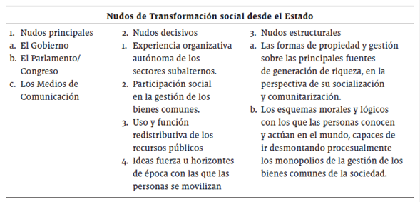 Bajo ese horizonte político, es lógico que el Estado transicional tenga la obligación de diseñar maneras activas y crecientes de intervención popular dentro del propio Estado, y, de igual manera, es entendible que, como lo señalamos hace un momento, el Estado genere posibilidades de intervención social de su propio “capital estatal”. Así pues, como lúcidamente lo delimita García Linera (2015a), los nudos de transformación estatal en donde debe concentrarse esta creciente participación social-popular deberán ser los siguientes (ver Tabla 1).