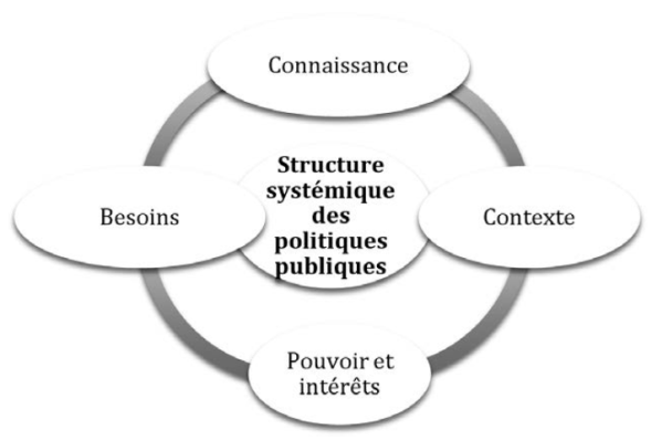 Pour confronter cette approche séquentielle, essentiellement linéaire et conceptuellement obsolète, nous considérons, depuis l’approche de la rationalité des acteurs, que « chaque politique publique est complexe ; sa compréhension ne peut être possible que grâce à une systématisation de ses unités d’analyse » (Mballa, 2017b, p. 65)2 Ces unités d’analyse (besoins, connaissances, contexte, pouvoir et intérêts) découlent précisément des convergences ou des points en communs entre les différents auteurs consultés. La Figure 3 représente cette structure systémique (unités d’analyse) des politiques publiques.