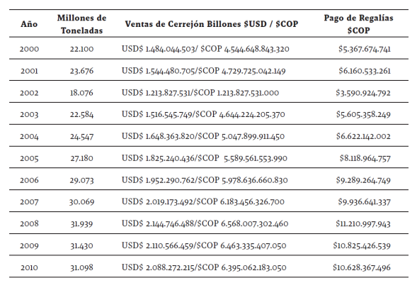 Las principales razones por las que se entregó el proyecto a multinacionales y a empresas estatales tienen que ver con que, en un principio, a través de la explotación del carbón, se iban a generar grandes inversiones en el departamento como consecuencia de la bonanza económica que iba a generar la actividad minera. No obstante, con el paso de los años los frutos de dicha inversión en la región brillaron por su ausencia y los problemas con sus habitantes aumentaron; aunque sí cabe mencionar que el dinero en términos de regalías y en excedentes económicos, por parte de la empresa multinacional, de hecho, aumentaron. En la Tabla 1 se muestra una relación entre las ganancias obtenidas por la multinacional y el aporte que tiene que otorgar esta por conceptos de regalías.