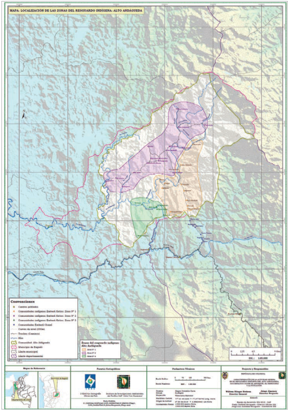 - IIAP, Instituto de Investigaciones Ambientales del Pacífico. (2015, diciembre). Informe Final y Cartografía de localización de las zonas del Resguardo Indígena Alto Andágueda [convenio interadministrativo no. 319]. Quibdó: Ministerio de Ambiente. 🠔