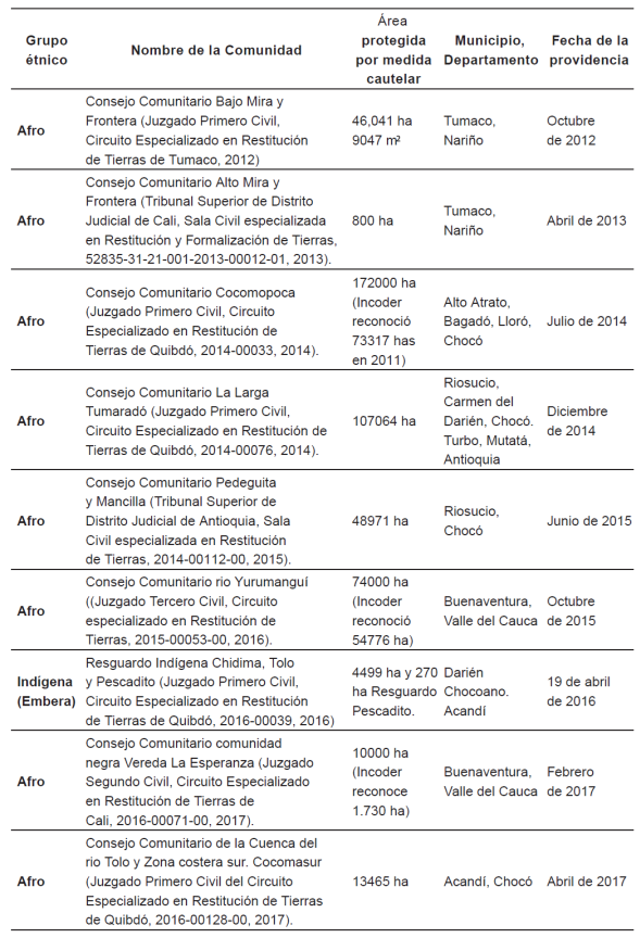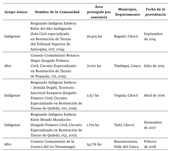 Hasta febrero de 2018 los Juzgados y Tribunales de Restitución en todo el país habían emitido diez sentencias de restitución a favor de comunidades étnicas. De estas, cinco casos se ubican dentro de la región del Pacífico. Asimismo, se han fallado 26 medidas cautelares en todo el territorio nacional, nueve benefician a comunidades en el pacífico.