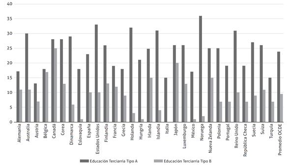 Gráfica 7: Porcentaje de la población entre 25 y 64 años que ha alcanzado educación terciaria tipo A y tipo B (2012)