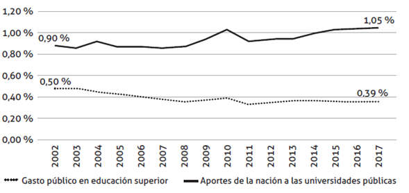 La brecha creciente entre el gasto en educación superior y el que se destina específicamente a las universidades estatales explica los problemas de desfinanciamiento que hoy afronta la universidad pública. Con un presupuesto que no aumenta de manera estructural desde 1993, las 32 universidades públicas deben financiar con recursos propios el 45 % de sus actividades. Actualmente, enfrentan un déficit en funcionamiento de tres billones de pesos y un desfinanciamiento de quince billones de pesos si quisieran adaptarse a los imperativos de cobertura, calidad, pertinencia e impacto social que exige el mundo contemporáneo.1