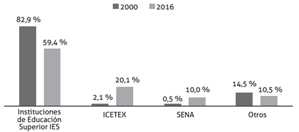 Este es el resultado de la determinación gubernamental de impulsar la educación para el trabajo como medio para masificar la educación superior a bajo costo y de su apuesta por garantizar la sostenibilidad presupuestal del sistema mediante la expansión y consolidación del crédito educativo como dispositivo fundamental de financiamiento. Se espera que, en el año 2034, el 65 % de los estudiantes que ingresen a la educación superior lo hagan en carreras técnicas y tecnológicas (hoy lo hace el 32 %). También que, para esa misma fecha, al menos el 49 % de los estudiantes que ingresen a pregrado y posgrado lo hagan aprovechando distintas modalidades de crédito educativo (en 2014 lo hacía el 13 % del total) (CESU, 2014; Mora y Múnera, 2014).