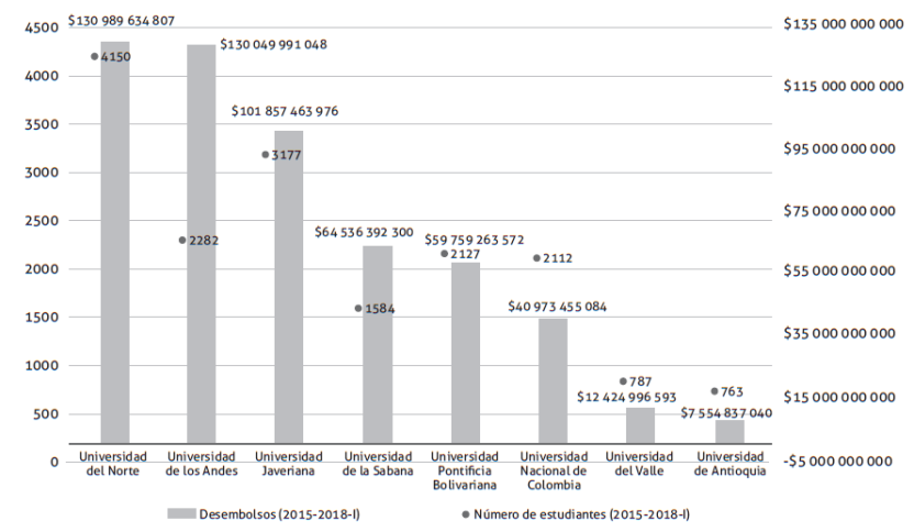 Sin embargo, vale anotar que dentro de las universidades privadas acreditas también existe una evidente concentración de los recursos, pues como lo muestra la Gráfica 5, el 46 % de los mismos (alrededor de 488 000 millones de pesos) han ido a parar a cinco de estas 29 instituciones. A estas cinco universidades también ha ingresado el 41 % de los beneficiarios que eligen una universidad privada.