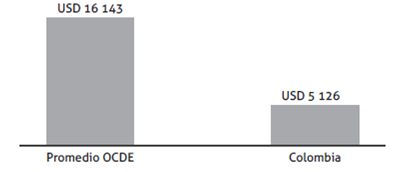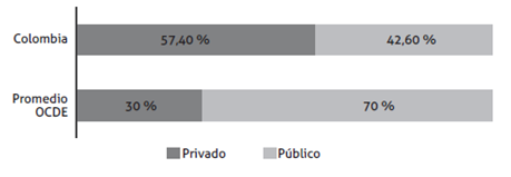 Pero las contradicciones van más allá de la estructura del sistema de educación superior, también se hacen evidentes cuando se observa el esfuerzo presupuestal de los países de la OCDE y la importancia que sigue manteniendo el gasto público en la provisión de educación superior. Tal y como lo muestra la Gráfica 8 y la Gráfica 9, los gobiernos de los países pertenecientes a la OCDE gastan, en promedio, tres veces más por estudiante que en Colombia, y no recargan el gasto educativo en los hogares.