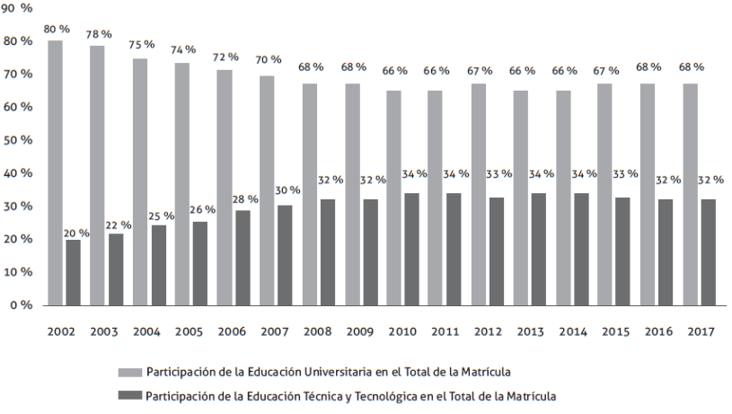 SPP no puede ser analizado sin atender a los objetivos que se han formulado en términos de la edificación de un Sistema Nacional de Educación Terciaria (SNET) y la promoción de las carreras técnicas y tecnológicas. De una parte, como lo muestra la Gráfica 10, los aumentos en cobertura en educación superior desde el 24 % en 2002 al 51,5 % en 2017 se pueden explicar por un mayor dinamismo de la matrícula en carreras técnicas y tecnológicas. Los estudios universitarios pasaron de cubrir el 80 % de la matrícula en 2002, a representar el 68 % en 2017. Para este último año, la matrícula total en nivel de pregrado fue de 2 280 327 estudiantes.