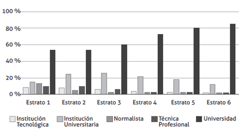 En el marco del sistema piramidal que se instaura, la mayor parte de estudiantes desaventajados socioeconómicamente será llamada a ocupar los segmentos de educación técnica y tecnológica, pues mientras que en el estrato socioeconómico uno, el 55 % ingresa a la educación universitaria y el 38 % lo hace a carreras técnicas y tecnológicas, en el estrato seis, estas cifras rondan el 80 % y el 18 %, respectivamente (Gráfica 11).