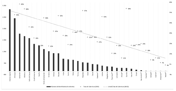 El problema de las desigualdades que se reproducen bajo el programa SPP se extiende también a las brechas regionales que hoy caracterizan al país en materia de pobreza y acceso a la educación superior. Tal y como lo muestra la Gráfica 12 y la Gráfica 13, y salvo algunas excepciones notables (Risaralda, Caldas y Quindío), en sus cuatro cohortes los beneficiarios del programa SPP se han concentrado en los departamentos que tienen las tasas de coberturas en educación superior más altas y descuida a los que tienen las tasas de coberturas más bajas. Es decir, hay una clara tendencia a incluir un menor número de beneficiarios en los departamentos con más bajas coberturas en educación superior. De otra parte, SPP beneficia a los jóvenes de los departamentos menos pobres; por lo cual, mientras más pobre es el departamento, menor es el número de estudiantes cobijados por el programa.