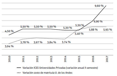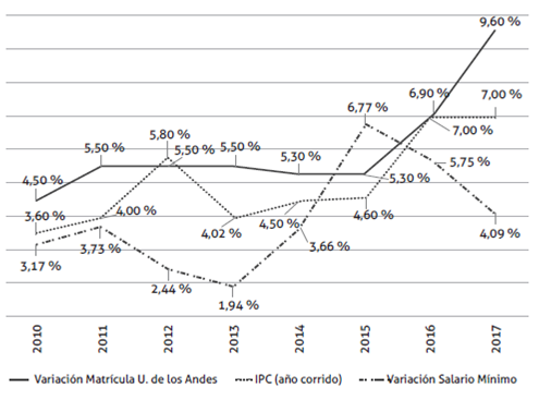 Los Andes ni siquiera es la institución que maneja el alza de precios más acusado. Según un muestreo realizado en cinco universidades tradicionales por el Observatorio de la Universidad Colombiana, desde 2007 el costo de la matrícula creció más en la Universidad del Norte (con un incremento promedio de 118 %), la Sabana (106 %), la Javeriana (113 %) y el Bosque (95 %). En la Universidad de los Andes subió un 90 % [En general] los costos de la educación superior también vienen creciendo desde hace años a un ritmo vertiginoso y por encima del Índice de Precios al Consumidor (IPC) […] Mientras que el primero aumentó en un 42 % y el salario mínimo un 70,1 % entre 2007 y 2016, los costos de la educación superior pasaron del 80 % al 120 %. (Revista Semana Educación, 2017, p. 49)