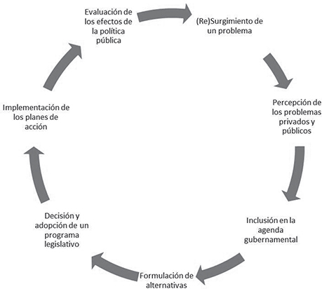 Knoepfel et al. (2006), siguiendo con el concepto ideal que concibe a las políticas públicas como un ciclo secuencial de fases, postulan que este inicia con el surgimiento de los problemas y se prolonga hasta la evaluación de los resultados obtenidos luego de la realización de una intervención específica para resolverlos (ver Figura 1). La primera de dichas fases, la fase de surgimiento y de percepción de los problemas, es definida por los autores a partir de Jones (1970), como aquella en la que una determinada situación produce una necesidad colectiva, una carencia o una insatisfacción identificable directamente o a través de elementos que exteriorizan esa situación y ante la cual se busca una solución.
