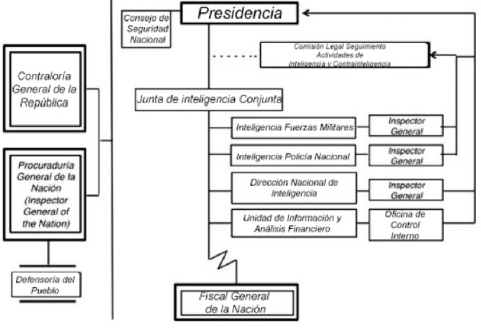 Los inspectores generales que vigilan las actividades de las unidades de inteligencia militar y de inteligencia policial rinden cuentas ante el Ministerio de la Defensa en asuntos administrativos y ante la Comisión del Congreso para dar cuenta de su acuerdo con las disposiciones de la ley. El Inspector General de la DNI y la Oficina de Control Interno de la Unidad de Información y Análisis Financiero (UIAF), respectivamente, se reportan ante la Presidencia de la República y la Comisión Legal del Congreso.
