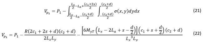 Substituting the values of σ p = 215.95 kN/m 2 , P 1 = 900 kN, M x1 = 300 kN-m, M y1 = 150 kN-m, L a = L x /2 into eq. (15)-(23) of part I and using the MAPLE-15 software are obtained: S tmin = 8.27 m 2 , L x = 2.03 m, L y = 4.07 m, σ 1 = 215.95 kN/m 2 , σ 2 = 108.86 kN/m 2 , σ 3 = 108.86 kN/m 2 , σ 4 = 1.77 kN/m 2 .
