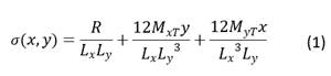 where: R is the sum of all the axial forces, M xT is the sum of all the bending moments around the X axis and M yT is the sum of all the bending moments around the Y axis, x is the distance parallel to the X axis measured from the center of gravity to the point in study, y is the distance parallel to the Y axis measured from the center of gravity to the point in study, L x is the distance in X direction of the footing, L y is the distance in Y direction of the footing. R, M xT , M yT , are presented in eq. (9)-(11) of the part I.