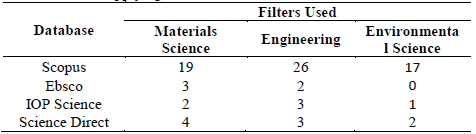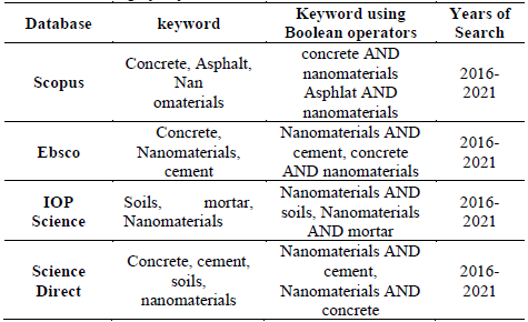In Table 1 that shows the distribution by years of publications taken from 2016 to 2021: a total of 62 articles were obtained from the Scopus database, 9 from Science-Direct, 5 from Ebsco, 6 from IOP Science, and while in Table 2, the search by keywords in English is detailed: nanomaterials, concret, asphalt, cement, soils, mortar; with the respective database, in addition to the use of Boolean operators, in order to enrich the present investigation and Table 3 shows the filters used in the search.