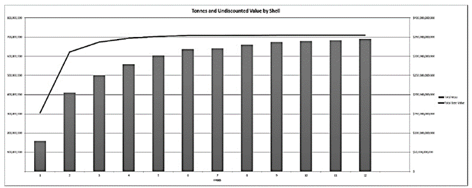 Este algoritmo se computó con una tasa de descuento del 10%, una ratio de producción anual definido en 60 Mt, un ángulo de pendiente predeterminado de 45° (para las dependencias), una altura de banco de 30m en representación del banqueo doble de 15m, y una variación del Revenue factor de 12 pasos iniciando en 0.1 y finalizando en 1.2, todos estos parámetros se basan en los supuestos del conocimiento y entendimiento del yacimiento hipotético.