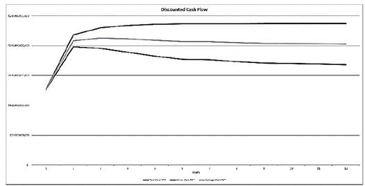 En Fig. 7 se pueden observar los diferentes escenarios para el flujo de fondos descontados, la línea superior corresponde a el best case, intermedia el average case e inferior el worst case.