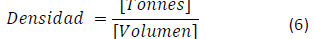 El campo de densidad (6) se define como la razón entre el peso asociado al bloque, y el volumen ocupado por este, para determinarlo, se usó el campo de masa que estaba definido en el modelo de bloques inicial en términos de toneladas, y el volumen de 90 m 3 que se dedujo de la extensión de los lados del bloque, informados en las características de la base de datos [3], este campo se calcula pues es una de las tres variables necesarias para correr el comando del Pseudoflow.