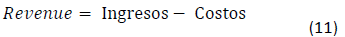Finalmente es (12) la última función asociada a nuestro proyecto, y se obtiene restándole los costos totales a los ingresos indicados en el Revenue, con el fin de obtener un campo con la valoración económica de cada bloque.