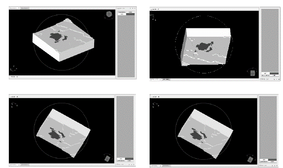 Figura 1: Vista a) frontal, b) lateral y c) superior d) del modelo de bloques del yacimiento polimetálico hipotético en el entorno gráfico de DESWIK.CAD.