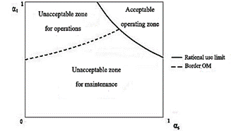 Classification of vehicles through the graphical method. The classification into acceptable or unacceptable operation is performed using the Rationality State Graph (RSG) [21] of freight vehicles. This graph is shown in Fig. 2. In this graph, the continuous curve represents the limit availability function according to eq. (4), the dashed curve represents the border between operation, and maintenance given by expression (15) in which αs is the independent variable as it is in (4). The classification requires that the coordinated pairs (αsi;αti) of each vehicle be located in the graph. Both indicators (αsi and αti) are calculated through expressions (16) and (17).