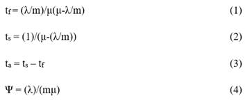 As a way of analyzing the current process, from direct observations, the average intervals between arrivals, the average service time and the average waiting time for customers in line for both conventional and priority cashiers were estimated. From that, arrival rates were calculated (λ), attendance (μ) and use of the system (Ψ), in addition to the average waiting time for customers in line, according to the analysis method adopted. The formulas referring to the average time of customers in queue (tf), average customer time in the system (ts), average service time ( t 𝑎 ) and rate of use of the system correspond to the equations (1), (2), (3) e (4).