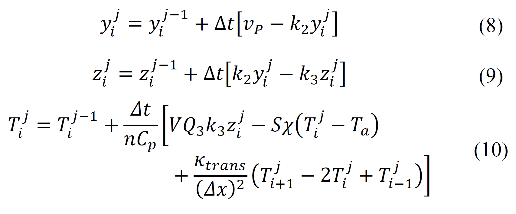 Here, k trans represents the heat transfer coefficient between two adjacent compartments. Note that coupling was made only in Fourier's heat transfer law, and there is no chemical exchange. Doing k trans = 0, in eq. (10), reduces it to eq. (7). It makes sense when thinking about the selectivity of a cell membrane.