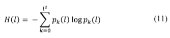 The prepared image is analyzed through a sliding square cell of side l. For a particular position of the cell, the number of pixels with value one contained in the cell is counted. Once the whole image is examined, it is computed Nk(l), the number of cells containing k active pixels, and N(l), the total number of visited cells. The probability associated with the state of the cell is thus defined as p k (l) = N k (l)/N(l) and the corresponding entropy is: