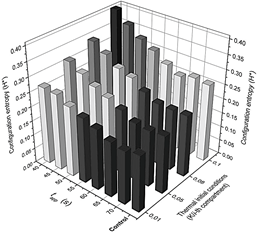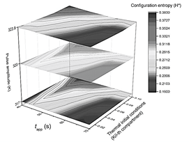 Figure 8: Detailed configuration entropy values reached by the system after being stimulated thermally by a pulse of 323.9 K. Pulse applying time and the slope of the thermal linear gradient were varied successively according to values reported in Table 2. Figures 6 and 7 are a 3D representation of the same 2D phase diagram presented in Fig. 3a.