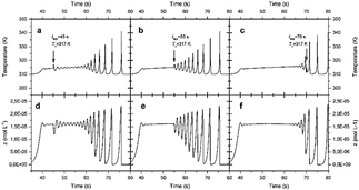 Figure 9: 2D graphs providing an overview of a single compartment (i = 1 ) response after being stimulated thermally. Each graph corresponds to a different thermal (a-c) or chemical (d-f) response. The slope of the initial thermal gradient was 0.1 K/i-th compartment, and pulses of T∆ = 317 K were applied at times tapp = 45, 55, and 70 s.