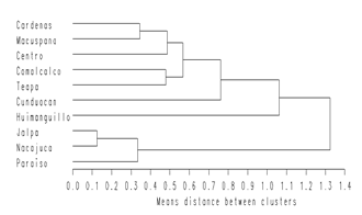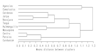 Figure 4: Dendrogram with the Euclidean distance of 10 municipalities in the state of Tabasco in which the quality of ULO was evaluated, based on four quantitative variables.