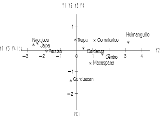 The distribution of municipalities by principal component analysis (PCA) is shown in Fig. 1. Huimanguillo and Comalcalco are in Quadrant I. Nacajuca, Jalpa and Paraiso are in Quadrant II, Cunduacan in Quadrant III, and Cardenas, Centro and Macuspana are grouped in Quadrant IV.