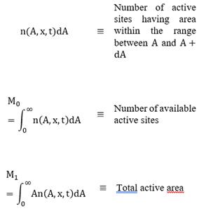 These reaction steps correspond to the coking and poisoning processes, respectively. To deduce the population balance equation is necessary to determine the internal coordinate. In this case, it is convenient to choose the active zones area A as the internal coordinate. Therefore, the general form of the population balance (see Equation (25)) is given by: