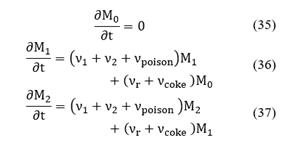 Note that M0 is conserved because there is no birth or death of active sites. Irreversible or reversible mechanisms are considered when studying poisoning and coking processes over the catalyst activity. According to νcoke and νpoison, for each mechanism, there are two specific rate constants: k+ and k_, if the process is considered irreversible, then k_ ≈ 0.