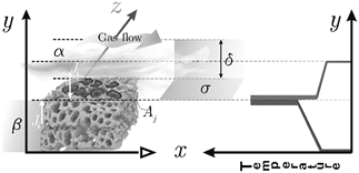 Fig. 1 represents a generic heterogeneous catalytic system. In the diagram presented on the left-side, there is a gas stream crossing over the catalyst where δ corresponds to the height of the gas film and σ is the interface that separates phases α and β. While the gas is flowing, the reactants are adsorbed onto the catalyst and react to form the product. The chemical reaction occurs at the gas-solid interface. It is important to note that the gas phase and catalyst are coupled systems, exchanging mass and energy. There is no chemical reaction in the gas phase, but there are diffusion and convection. It is assumed that convection is a one-dimensional phenomenon over x axis while diffusion occurs over x and y axis. The gas is not confined; hence there is no hydrodynamic pressure gradient, and instead of that, there is a pressure gradient due to concentration changes. On the other hand, there is no convection in the catalyst. The chemical reaction is carried out across the x axis, and diffusion is a two-dimensional phenomenon.