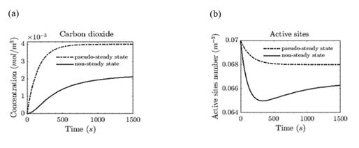 Figure 3: Concentration of chemical species comparing pseudo-steady state and non-steady state. (a) Molar concentration of CO2 produced during the reaction. We compared the pseudo-steady (dashed line) and non-steady (solid line) assumptions. (b) Number of active sites per volume of catalyst. Under pseudo-steady state assumption, the number of active sites (dotted line) does not decrease faster than the non-steady profile.