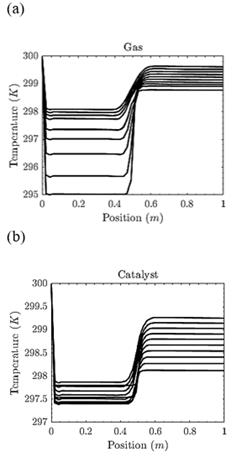 Figs. 5(a) and (b) show the temperatures profiles in the gas phase and the catalyst, respectively. The adsorption steps of the chemical mechanism consume energy, and for this reason, the catalyst and gas temperatures decrease. Nonetheless, when the adsorbed species react, the temperature increases due to the exothermic nature of the reaction.