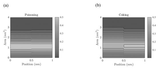 Fig. 7 shows the active site area distribution, which is the average area of the population of active sites. In Fig. 7(a), the light colors indicate that, along the spatial coordinate, most of the active sites have an area between 1.10 - 1.15 nm2 while the dark colors indicate that a small portion of the population of active sites has an area between 2.5 - 4.0 nm2. In Fig. 7(b), the light colors indicate that, along the spatial coordinate, most of the active sites have an area between 1.18 - 1.20 nm2 while the dark colors indicate that a small portion of the population of active sites has an area between 2.5 - 4.0 nm2. The average area of active sites in both scenarios is statistically equal, so it is impossible to establish with certainty which mechanism has the most significant influence on the catalyst deactivation process.