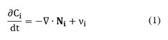 The source term νi is the net formation rate of specie i by chemical reactions per unit volume. The sign convention is such the rate is positive if there is the net formation of species i, and negative if there is net consumption. The rates of heterogeneous reactions appear only in interfacial conditions. In addition, Ci is the molar concentration of the specie i (in units of mol/m3). The total molar flux Ni involves the convective and diffusive fluxes of species i:
