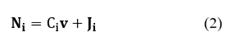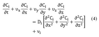 The first term in Equation (2) corresponds to the convective flux and the second term is the diffusive flux with Ji being the molar flux of specie i relative to the mass-average velocity, ν. When density and diffusivity are constant, the conservation equations for species i can be written as: