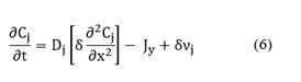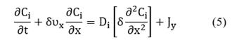 Where Jy is an average diffusive flux over y-direction and corresponds to the net velocity of adsorption and desorption, Jy ≈ υads + υdes, being υads the adsorption rate and υdes the desorption rate. These quantities depend on the reaction mechanism. The second term on the left-hand side of Equation (5) is the convective contribution in the mass balance, and the first term on the right hand is the diffusive term, both in x -direction.