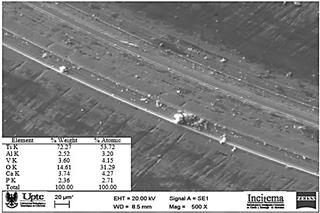 The loss of mass is ratified by performing the weight before and after the wear test, in the same way when evaluating the composition of the oxide layer after the test is found the presence of phosphorus and calcium elements that constitute the composition of the bone ball as observed in Fig. 7. Therefore, the increase in hardness is corroborated when exposing the material to the anodizing treatment, presenting adhesive wear understood as the transfer of material from one surface to another during its relative movement. In the same way the figure shows the wear mark and some of the adhesions of the alloy surfaces, however some of the material detached from the bone ball and attached to the titanium specimen is released in the form of chips.