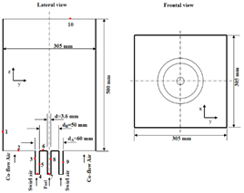 Figure 1: Lateral view and frontal view of the computational domain used for the simulation of the SMA1 flame.