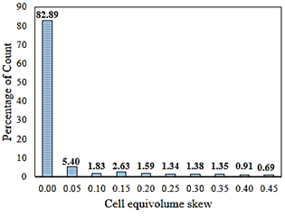 Fig. 3-4 show the histograms of Cell equivolume skew and the orthogonal quality of the SMA1-flame mesh. Two mesh quality criteria were used, the cell equivolume skew and the orthogonal quality. About 82 % of the mesh cells count have a cell equivolume skew between 0 and 0.08. The other cells percentage have at least a cell equivolume skew less than 0.69. According to Ajit and Fergal, values of cell equivolume skew of 0 to 0.25 are considered excellent, 0.25 to 0.5 are good and 0.5 to 0.75 are fair 30. About 95 % of the mesh assessed is excellent and the other 5 % still being good.