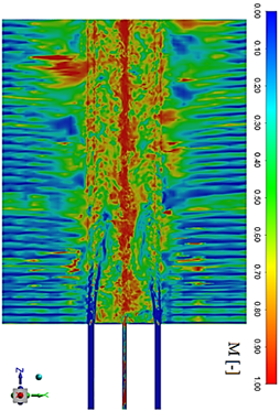 In this case, the Eddy-Dissipation model with single global reaction was used for accounting for chemistry-turbulence interaction. For the RANS precursor simulation (incompressible steady state simulation using the SST k - ω turbulence model) were solved momentum, turbulent kinetic energy, turbulent dissipation rate, energy, species mass fraction and P1 RTE equations by means of the FVM. The Pseudo-Transient Coupled algorithm was used as a pressure-velocity algorithm. First-order-upwind numerical scheme was used for turbulent kinetic energy and turbulent dissipation rate equation terms. Second-order-upwind numerical scheme was used for the discretization process of momentum, energy, species mass fraction and P1 RTE equation terms, including pressure gradient terms. It was established as convergence criteria residual for energy and radiation in the order of 1 × 10-9 and for the rest of the residual in the order of 1 × 10-6. The results from the precursor simulation were used for initializing the LES simulation, which is a fully 3D transient simulation. A LES turbulence modeling approach was adopted, using the Dynamic Smagorinsky-Lilly sub-grid model. A Bounded Second Order Implicit Transient Formulation was used for the time discretization terms. Also, Bounded Central Differencing numerical scheme was used for the discretisation of momentum equation terms, considering the mesh spacing used a time step in the order of 1 × 10-6 s. The convergence criteria was established by means of a residual in the order of 1 × 10-6 for the energy and P1 RTE equations and for the rest of the residual in the order of 1 × 10-3.