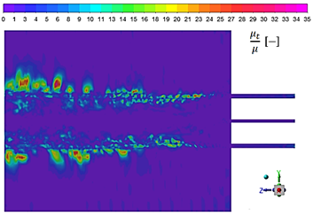 Another approach to quantify the resolved turbulent kinetic energy is the viscosity ratio, which is directly related to the Large Eddy Simulation Index Quality (LES_IQ) proposed by Celik et al. 35. Values of viscosity ratio below 20 suggest that more than 80 % of turbulent kinetic energy is resolved. Fig. 6 shows the contour of viscosity ratio, where can be corroborated the failure of index quality M on the zones with a height mesh aspect ratio for assessing the resolved turbulent kinetic energy. Nevertheless, from the figure can be appreciated that still insufficiently resolved the turbulent kinetic energy. Several spots on the shear layer zone showed a resolution smaller than 80 %.