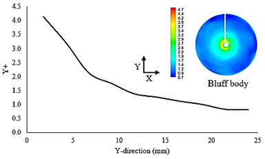 Unfortunately, the meshing process is not a straightforward process and no clear consensus appears in the literature about how to build a heigh quality LES-Mesh. Nevertheless, some common ground has been reached in relation to near-walls resolution and the Y + parameter. According to Launchbury this parameter has to be less than one and should be always checked for the walls of interest 3. Fig. 7 shows the Y + distribution over the bluff body wall, where seems that only above 19 mm in the radial direction of the bluff body the Y + is less than one. The figure indicates that near-wall resolution over this important wall for the present case study is insufficient.